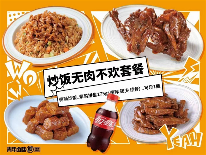 青年卤味局满足群体”好吃、有趣“的需求,彰显大食客个性与自我的品牌属性,倡导当代青年努力向上正能量精神。产品主要采用颗粒饱满的大米打底,码上各种鲜卤肉食,再搭配营养均衡的蔬菜。所有卤味都是现卤,采用秘制配料。一勺沸腾的卤汁,加上拌饭灵魂剁椒,最后在碗中拌开。大块卤肉加鲜美卤汁,带来无法复制、欲罢不能的味蕾体验。