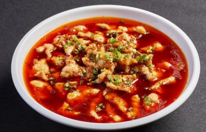 包记水煮肉片食材新鲜,现点现切!经验丰富的师傅动作利落的切片,整片的鸡肉被切成薄厚均匀的肉片,妙笔生花~鸡肉片片薄如蝉翼,粉白粉白的,夹起一片来,隐隐还透着光!
