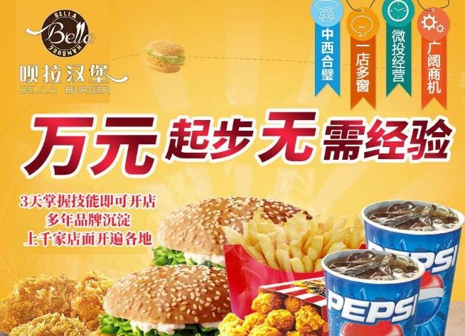 呗拉汉堡,中西合璧,一店多窗,微投经营,广阔商机,快餐加盟品牌中的新贵。呗拉披萨汉堡,起步容易,无需经营经验,经过培训短期可掌握技能,创业开店就这么简单。