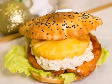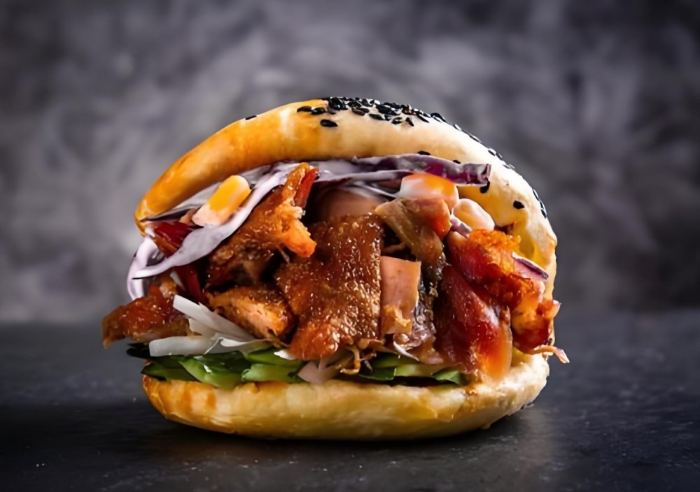 不老基中国汉堡中式汉堡的京都烤鸭中国汉堡用手工现烤堡胚代替传统饼皮,铺上生菜、黄瓜丝和泛着油光的烤鸭肉,挤上满满的秘制烤鸭酱,再撒上葱条,猎奇的中西结合却毫无违和感!略带韧劲的堡胚夹着肥而不腻的烤鸭,一口咬下去满满都是肉。