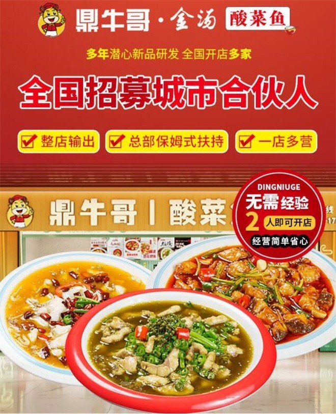 终端支持:鼎牛哥金汤酸菜鱼店面选址、店面装修、产品培训和物料费用全面支持;