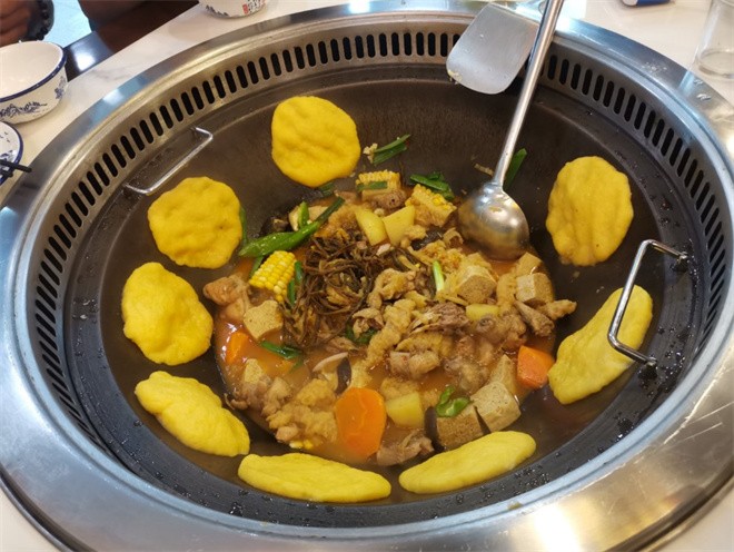 大嫂铁锅炖的第一口铁定是留给鸡肉的,外层裹满了酱汁,炖得软嫩入味,一口满足。鸡肉翻炒入味后,加水等待沸腾,将和好的玉米面贴到锅边,盖盖靠炖水蒸气加热,玉米饼很是香甜,中间松软,边缘酥脆,蘸点汤汁回味无穷。如果再加入灵魂粉条,这一锅铁锅炖可以让四口之家吃的满足。