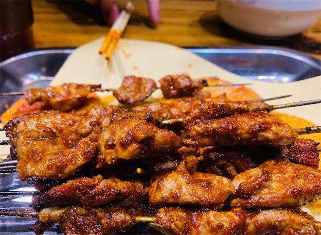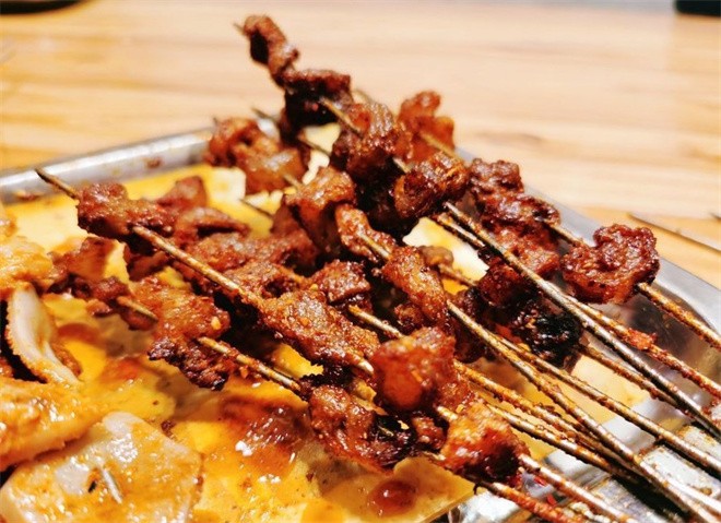 推开金郡大自然玻璃门的瞬间,混合着孜然、辣椒与烤肉的香气扑面而来。明档里,师傅们正麻利地翻动着滋滋作响的肉串,火星四溅中,油脂滴落在炭火上,升腾起令人垂涎的烟雾。招牌的羊肉串选用甘肃本地羊后腿肉,肥瘦相间,炭火逼出油脂的焦香,撒上一把兰州特有的粗粒孜然,入口鲜嫩多汁,毫无膻味。除了传统烤肉,这里还能尝到地道的兰州风味。烤羊肚脆嫩弹牙,烤板筋嚼劲十足,而那一盘炒面片更是隐藏菜单上的明星——宽面片裹着油泼辣子的香气,配上几串烤肉,就是最地道的兰州"肉面"组合。