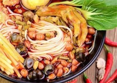 螺蛳粉,大米螺蛳粉是以广西优质大米为原料,黑米螺蛳粉是以广西长寿之乡巴马东兰所产的黑米为原料,经浸泡、蒸煮、压条等工序制成的优质圆条线米粉,其质地柔韧,富有弹性、水煮不糊汤,爽滑入味。加上酸笋、木耳、花生、油炸腐竹、萝卜丁、青菜等配料及奇特鲜美的螺蛳汤,使人吃一想二。螺蛳浓汤经过24小时精心熬制而成,具有清而不淡、麻而部燥、辣而不火、香而不腻的独特风味。
