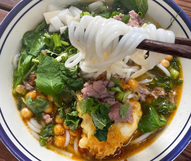 高大山生烫牛肉米线,拒绝使用冻牛肉,精选新鲜的牛大脊肉,也就是所谓的吊龙,这个部位的肉质鲜嫩口感极佳,牛肉都是采用现切现烫的方式,最大程度还原了牛肉本身独有的醇香。配料中的芫荽(香菜)都是老品种,价格贵但那独特的香气,是普通香菜无法比拟的,米线中的豌豆尖是配料中的灵魂,清新的口感是其他蔬菜没有的,成本高但每一碗都必须有!,还有那喷香的胡辣椒都是手搓而来,选用地道的贵州辣椒香而微辣。