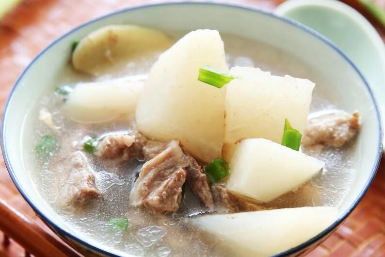肉烂汤甜,汤汁乳白,可饮汤食肉。羊肉含蛋白质、脂肪、碳水化合物、维生素Bl、维生素B2、尼克酸、钙、磷、铁等。其性温味首,温中散寒,化滞,健腺益气,温补肾阳,对虚劳赢瘦,乳汁不下有一定功效。怀牛膝味苦酸,性平,有强筋骨,活血通经作用。此菜以羊肉为主料,配以多种中药,有健胸作用。