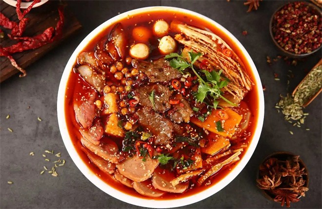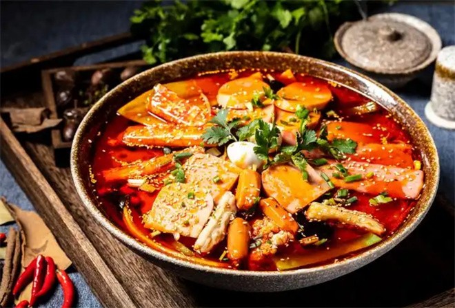 九品冒菜,也形成了麻不刺喉、辣不上火、滋补营养、色泽鲜亮、口味醇厚、一年四季老少皆宜的冒菜。九品冒菜有清汤锅、红锅之分,红锅的味型又有辣与不辣之分,广受各地食客的青睐。