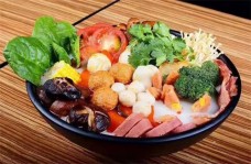 六福冒菜可以冒多种绿叶蔬菜、豆制品原料、海带等藻类、蘑菇等菌类、薯类、鱼类、蛋类、肉类等,你可以凭个人喜好随意搭配,也可以将新鲜蔬菜和肉丸、肠片、蛋类等比例进行科学搭配,只需花很少的钱,既可以享受美味,还可以补充维生素和蛋白质。