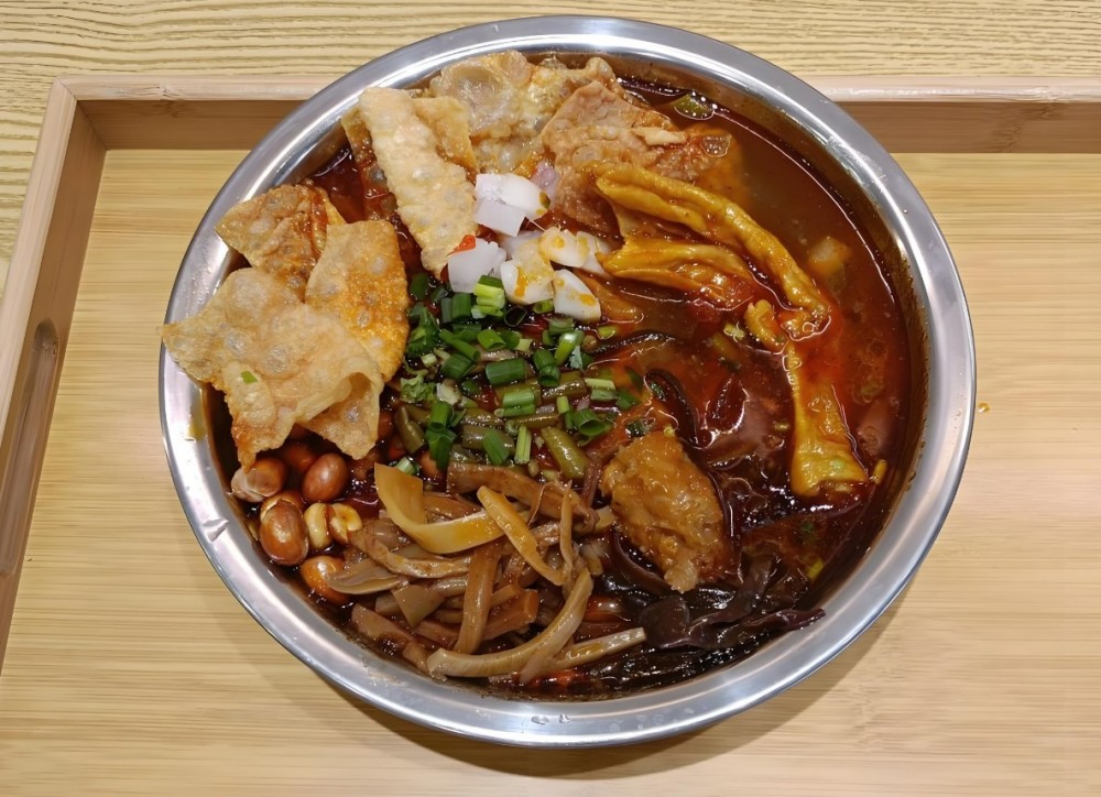螺府螺蛳粉包含了传统螺蛳粉的所有配料,酸笋、木耳、萝卜干、青菜,还有粒粒分明的花生和螺肉,上桌先是酸笋的香气扑鼻而来,再看色泽,平时吃粉的螺蛳汤居然变成了粘稠浓郁的螺蛳酱汁,红澄油亮地裹在弹牙的圆米粉上面,入味而且有嚼劲,加上肉片、洋葱、胡萝卜、指天椒等配料的搭配,整碗粉看起来满满当当,越吃越上瘾,越嚼越够味。