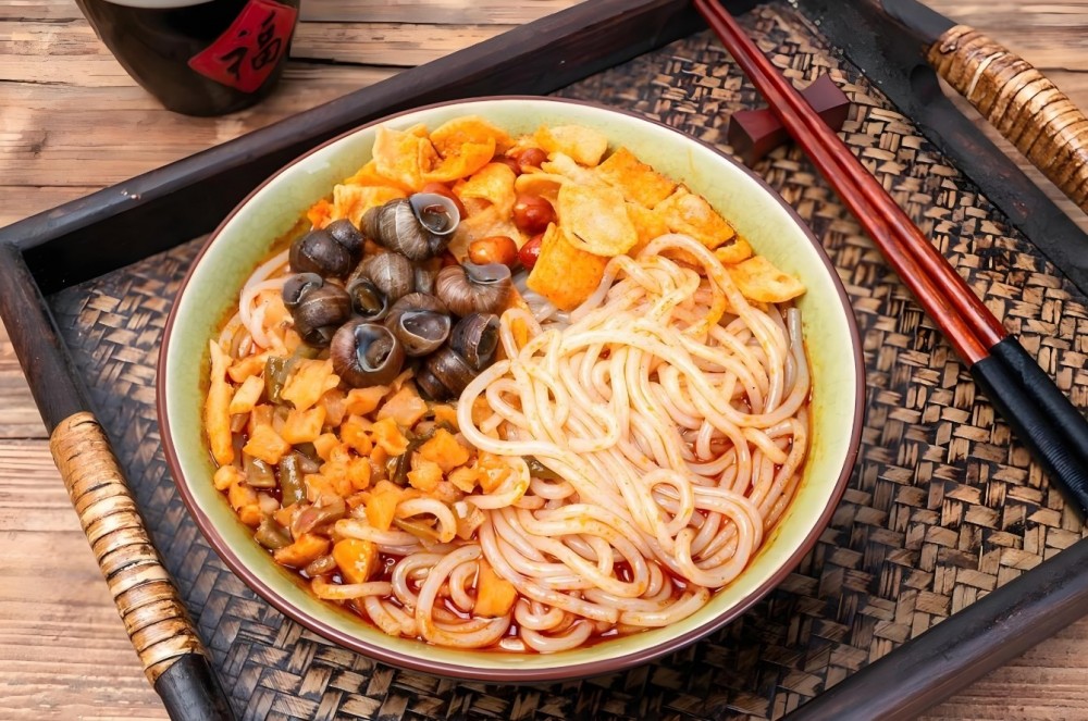 螺蛳粉由柳州特有的软韧爽口的米粉,加上酸笋、花生、油炸腐竹、黄花菜、萝卜干、鲜嫩青菜等配料及浓郁适度的酸辣味和煮烂螺蛳的汤水调合而成,螺小五螺蛳粉因有奇特鲜美的螺蛳汤,使人吃一想二。
