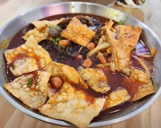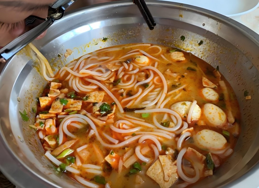 田螺鸭脚猪脚煲,鹌鹑蛋、油豆泡、鸭脚、筒骨、鸭脚、炸腐竹、酸笋、田螺、芋头…辣辣的口感,越吃越上头!放一些虾滑、青菜、鸭血进去,更加“惹味”,幸福的感觉。筒骨螺蛳粉也是招牌,一大块猪骨,轻轻一咬,骨肉分离,嫩滑多汁!螺蛳粉酸酸辣辣的口感,味道好绝,谁能不爱!