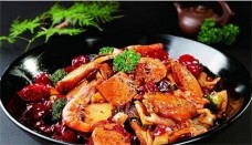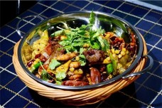 天南地北入一锅:麻辣香锅,主材料选用虾、蟹、田鸡、肥肠等,配上野山菌、青笋、腐竹、土豆等素菜,炒出麻辣干香味道,虾鲜、肠脆、肉嫩,笋片清香,腐竹可以吸收各种肉类和海鲜的鲜味,加上本身的香味,混合起来,成就了“一锅香”。内容混搭有荤、有素、有淡、有辣、有自然形成、也有人为加工,看上去已觉天南地北的食材,融入一锅,就如时尚界将五颜六色混搭在一起一样,享受的是丰富与多样。