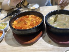娜美汤饭,主打的是米肠汤饭,米肠汤饭真的是料足到不行!里面有虾皮酱、腌制韭菜、青椒末、辣酱和葱花,简直是五味俱全。小菜方面有泡菜和辣萝卜,泡菜酸酸辣辣的,辣萝卜则有点微甜,整体感觉还行,但没有特别惊艳。