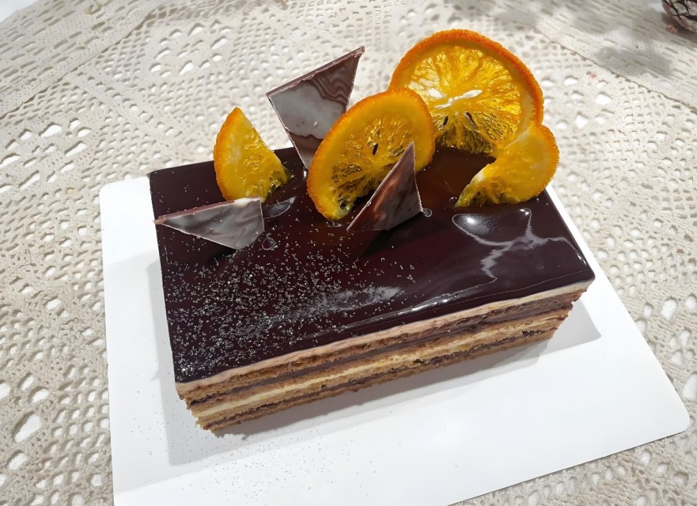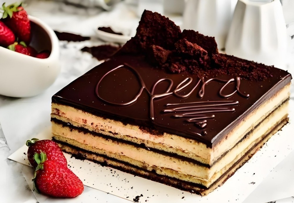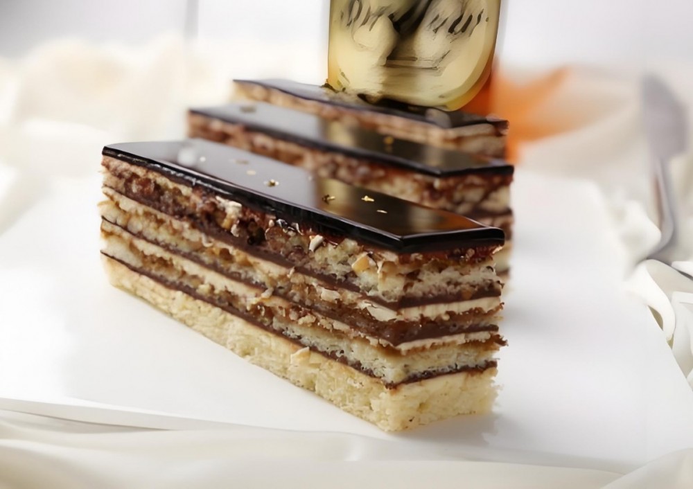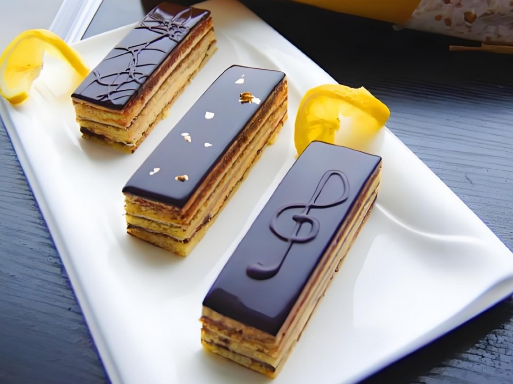 欧培拉蛋糕,法国知名甜点,是款有着数百年历史的蛋糕,那浓郁的巧克力与咖啡味令每个爱吃巧克力的人都迷恋不已。传统的欧培拉共有六层,其中包括三层浸过咖啡糖浆的海绵蛋糕和牛油、鲜奶油和巧克力奶油并以此做成的馅,充满咖啡与巧克力的香味,入口即化。
