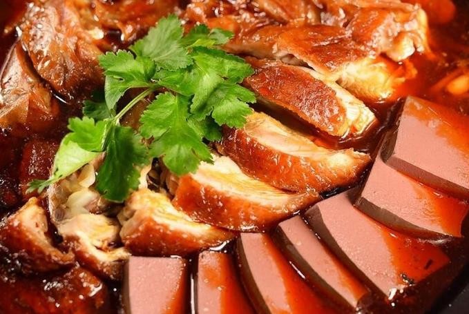 四川冒烤鸭讲究先烤后冒,肥美的鸭子先进炉烘烤个九分熟,烤得表皮焦黄、外酥里嫩再开始冒。油亮亮的烤鸭切成块,放到冒菜的汤锅里面冒一会儿捞出,上桌后浇上汤汁,鸭肉变得肥厚多汁,任何一个人都无法拒绝诱惑!火辣辣的香气来势汹汹,彪悍开场!沉浸在红汤锅里的烤鸭,早已酥嫩脱骨,也更入味!咬一口烤鸭外皮还保持脆润的状态,麻辣鲜香的汤汁全都钻进了烤鸭肉中,吃起来汁水在口中四溢,谁能不爱?