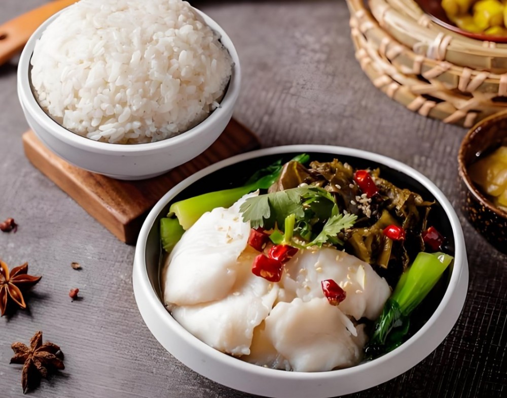 往高汤中下料包,然后稍等片刻后,把事先准备好的鱼片下锅,不用太久,基本下锅片刻即可同鱼汤一起倒入放酸菜的汤盆中,点缀些葱花干红辣椒,热油一浇,只听得“兹~”的一声,一份色香味俱全的食缘素酸菜鱼便好了。此时在来上一份香喷喷的大米饭,配着鲜香四溢的酸菜鱼,只能说上一句足矣足矣!