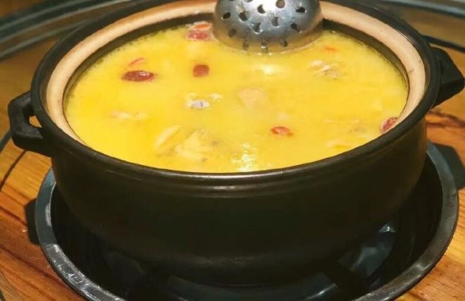 顺德公猪肚鸡采用传统秘方烹制,配以农家自养土鸡,新鲜蔬菜的同时,不断对猪肚鸡进行改良换代。创新味道,做出传奇美味,深受市民喜爱。顺德公猪肚鸡的精华尽在汤水之中,因而吃这道菜特别有讲究,一定要“一锅四味”:第一道浓香,喝原汤汤白浓郁味厚;第二道甘香,喝菌菇汤汤甘味纯;第三道清香,喝海鲜肉类汤汤香味鲜;第四道味甜,喝蔬菜煮后的汤甘甜味美。