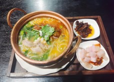上汤云南过桥米线跨越2000多公里飞来的米线,很云南很地道。米线每天上客前,要提前过水煮,捞出来的米线口感水灵灵的,QQ弹弹,爽滑不粘黏。这里不仅有非遗传承技艺,还为食客们带来了纯手工打造的紫铜碗,呈现绝佳的味蕾及视觉效果。紫铜碗耐高温,足足300℃,可维持鸡汤的温度、烫熟食材,这是过桥米线的精髓所在。
