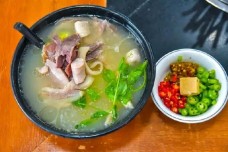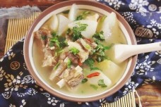 菏泽位于山东省的西南部,称之鲁西南,有牡丹之乡的美称,菏泽名吃众多,有“曹州此城古,菏泽名吃多”的说法。羊肉汤是菏泽当地的一种民间传统小吃.利用当地有利的地理条件,黄河“大沙滩”上生长的鲁西南青山羊,青山羊是标准的绿色食品,纯农家喂养,肉质鲜嫩,在两岁左右较好,加上屠家传统的制作工艺和二十余种中草药,秘方研制,使汤色乳白,油质较融,达到了鲜而不膻,肥而不腻、回味清香的口感,特别在冬季,有滋补、祛寒、健身养胃之功效。