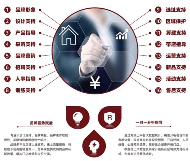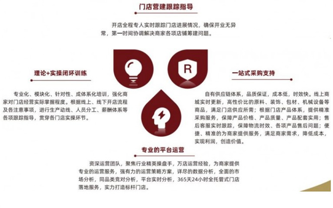 品牌拥有资深运营团队,聚焦行业精英操盘手,万店运营经验,为商家提供专业的运营服务,强有力的运营策略方案,详尽的数据分析,全面的市场分析,同品类竞对分析,平台实时分析,365天24小时全托管式门店落地服务,实力打造标杆门店。
