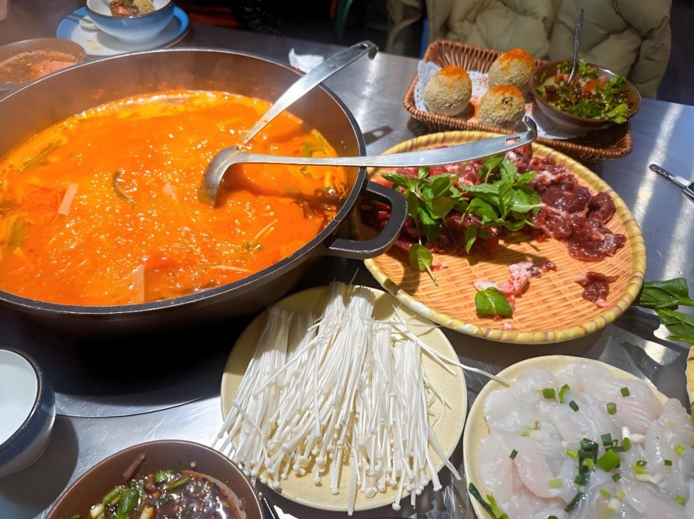 野厚咧贵州酸汤牛肉火锅真的太赞了!锅底是正宗的贵州酸汤,每天新鲜现熬,传承古法自然发酵,酸爽开胃,直接喝酸汤烫牛肉,味道就超级棒!现切牛肉也是一绝,千万不要烫太久,十秒就够了,口感鲜嫩爽滑!还有那个毕节锅巴土豆,外焦里嫩,配上特制的酱汁,简直绝了!贵阳脆哨饭超级上头!