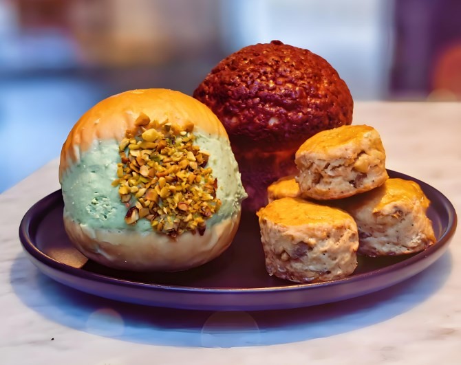 志花的面包店夹心的黑糖糯糯叽叽的超级Q,吃起来有焦香的味道,麻薯也是很筋道的口感,出乎意料的好吃,越吃越香!蓝莓旋风椰奶包自熬蓝莓果酱,散发出香甜气息。蓝莓果酱一圈圈点缀在面包上,吃的时候,一圈圈的果酱风味在舌尖交织回旋。